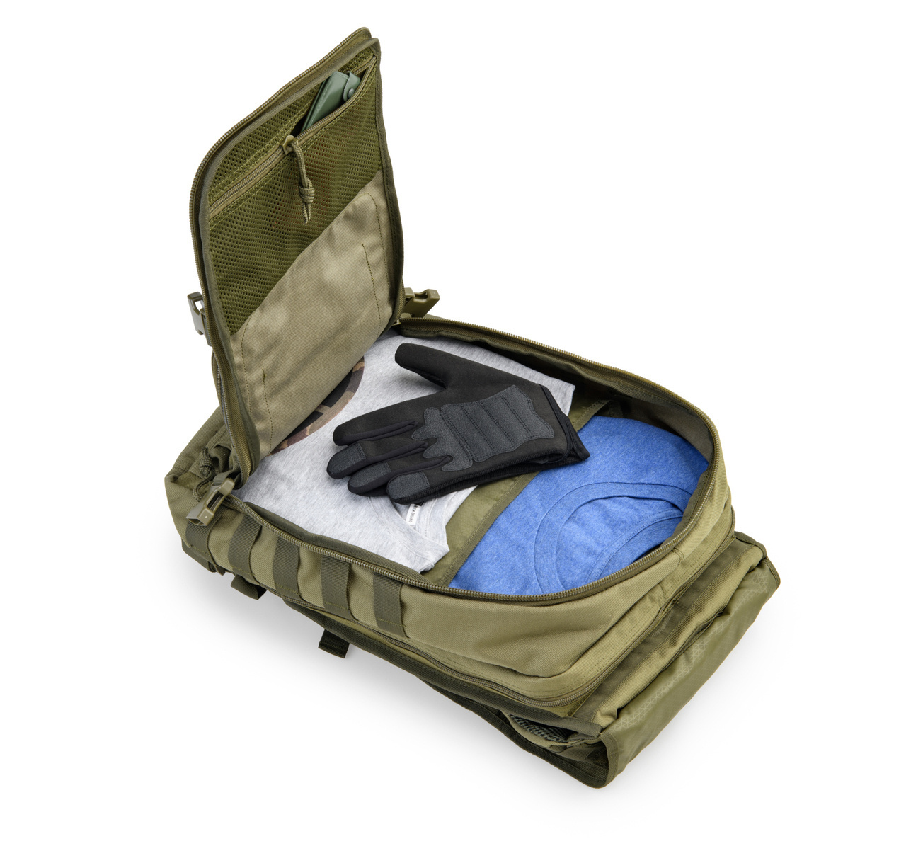 Buzunarul exterior are chingi MOLLE superioare și puncte de fixare, un mâner de transport de urgență și 3 porturi pentru accesorii.